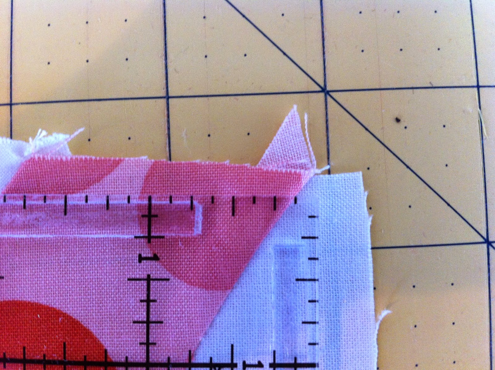 Now, let's square up our block to a 10" square. The W/P/T blocks have been sewn together, the triangles have been sewn on and seams pressed open.
