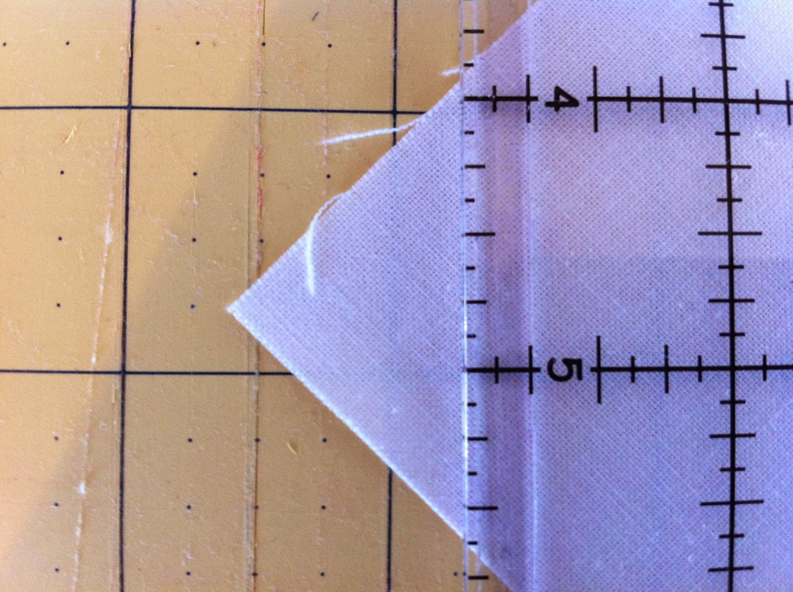 Begin by positioning diagonal line on square-up ruler over diagonal center seam on block then line up triangle seams under the 3 5/8" marks on ruler. The diagonal seam and line on ruler may be off by just a bit but not to worry, it's more important that the triangle seams are under the 3 5/8" marks.