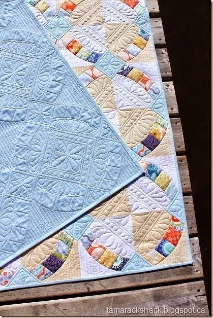 "After I pieced the top I made a few sketches of what I wanted to do for quilting designs, I knew right away what I wanted to do in the center of the circles and in the blue diamonds but no idea what to quilt in the background between the circles. I decided to just load the quilt and see what happens. Well after glancing at the cover of the pattern I realized that I like the vertical lines Jenny did as it allows the design in the circle to be the focus so that’s what I did.... For the main quilting design I created a double lined square and pebbled between the double lines. Added a feather motif to the curved area and a Petal feather in the center. I used the same Petal feather in the blue diamonds. I stitched in the ditch along the curved piecing and between all the piecing in the rings."
