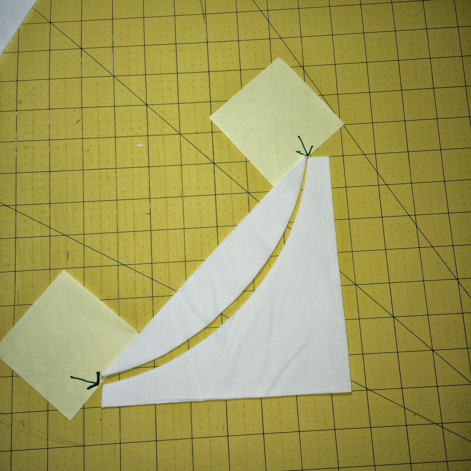 Cut 7 1/2" x 7 1/2" background fabric square in half diagonally. Measure 1/2" on each tip and cut off.