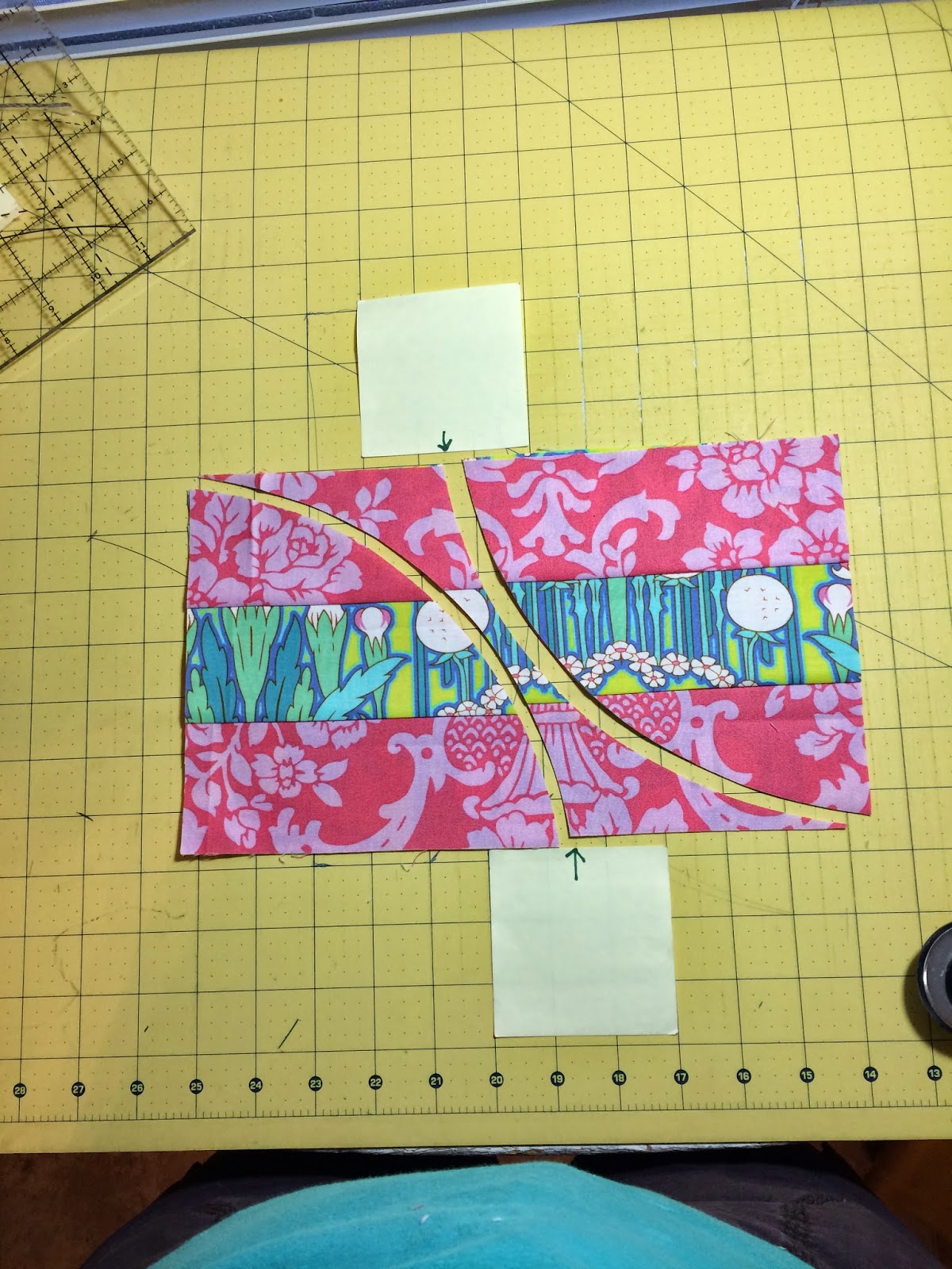 Lift ruler, rotate block, line up previously cut sides with 6" marks on ruler. Trim right and top. Repeat for all AB curved sets.