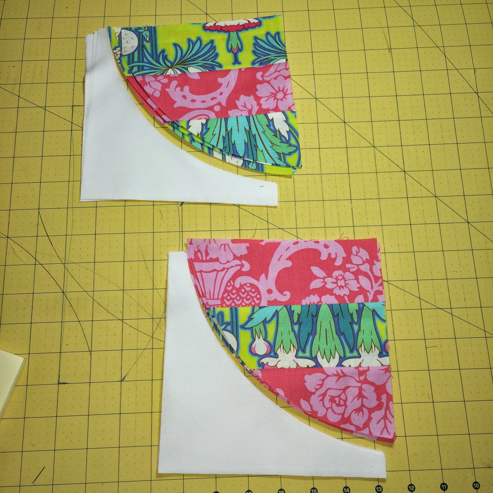 Position A on B as shown leaving a 1/4" to 1/2" tail of B. Holding one piece in each hand, slowly bring curved edges together as they feed under presser foot. Repeat for all A and B shapes. Press seams towards print fabric.