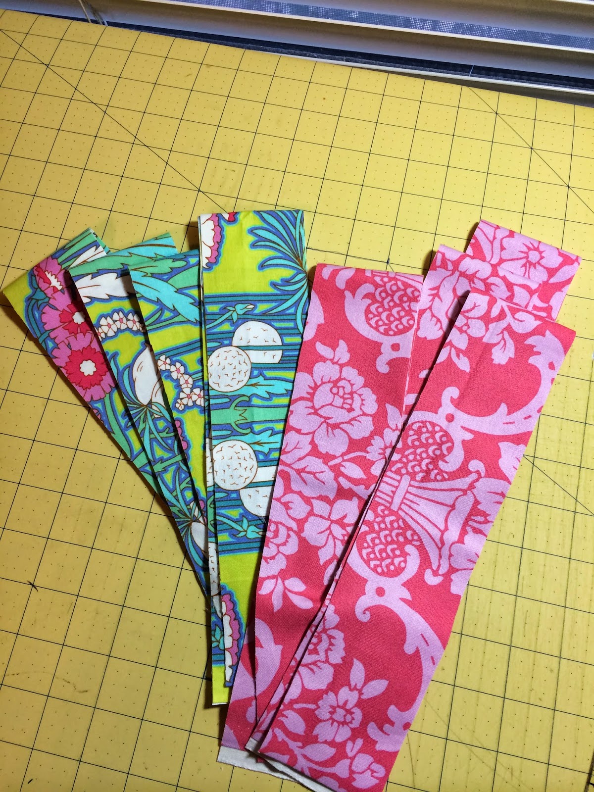 If using assorted prints, sew 3 strips together. Make (3) sets. Press seams all same direction.