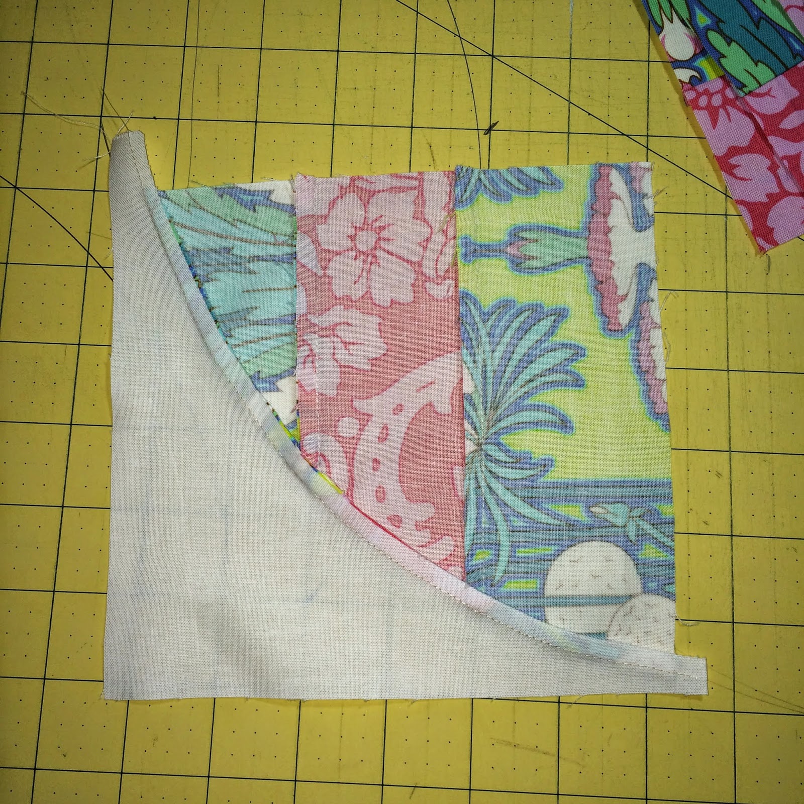 Layout (4) 6" x 6" strip set blocks previously cut as shown. (Using 2 of each color way if using two coordinating prints.) Position 3" x 3" centers on corner. Sew on drawn line. Trim corner a 1/4" from stitched seam. Press seam open.