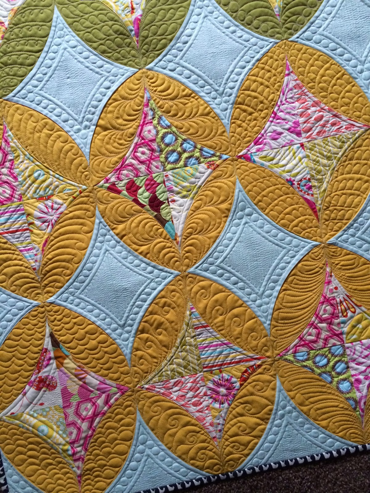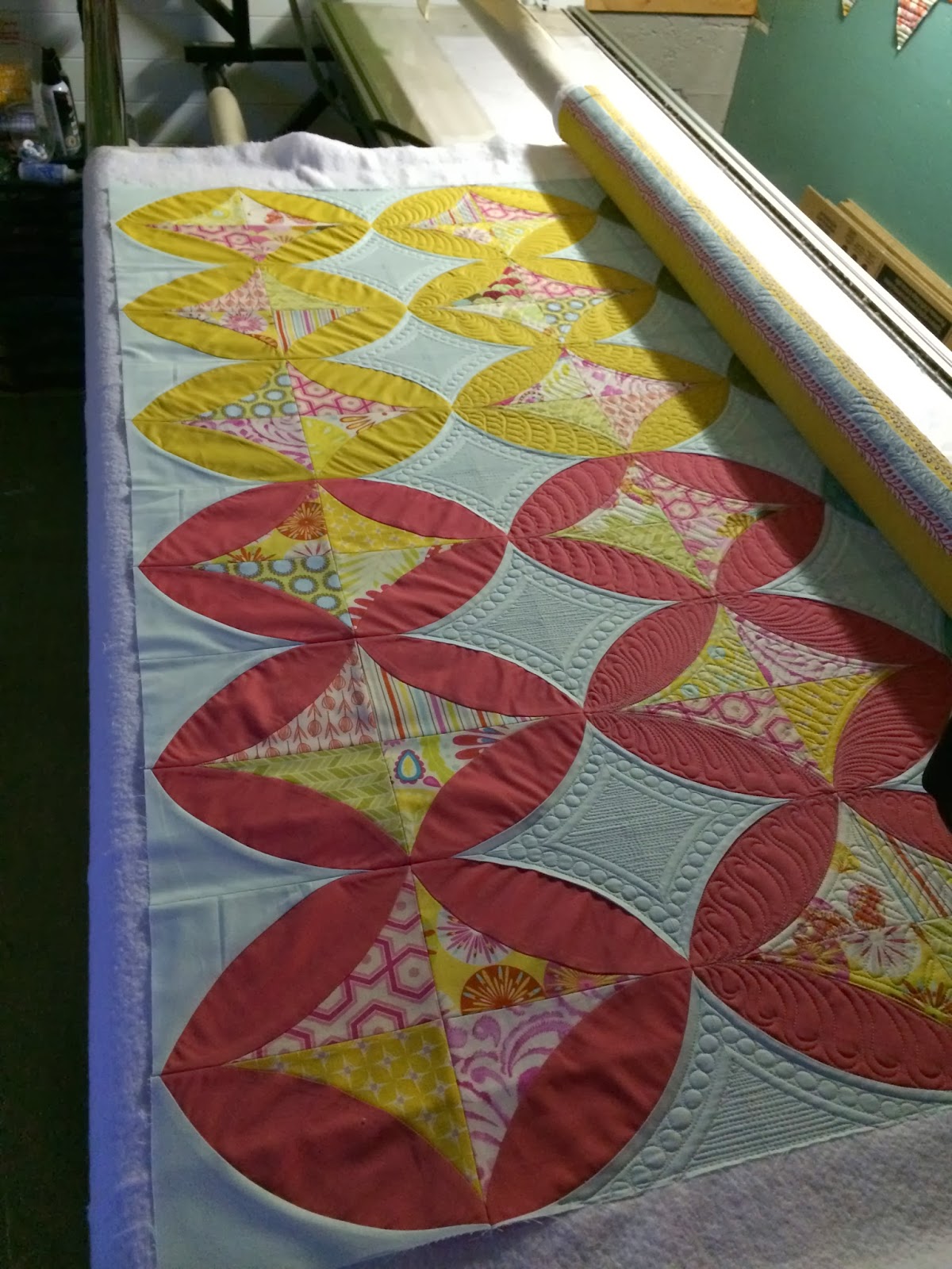Half way through the quilt I thought of a great quilting design for the print diamonds and had to do one out of curiosity. It's the bottom left block in the picture above.