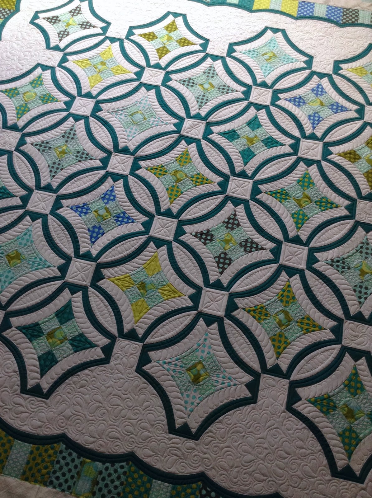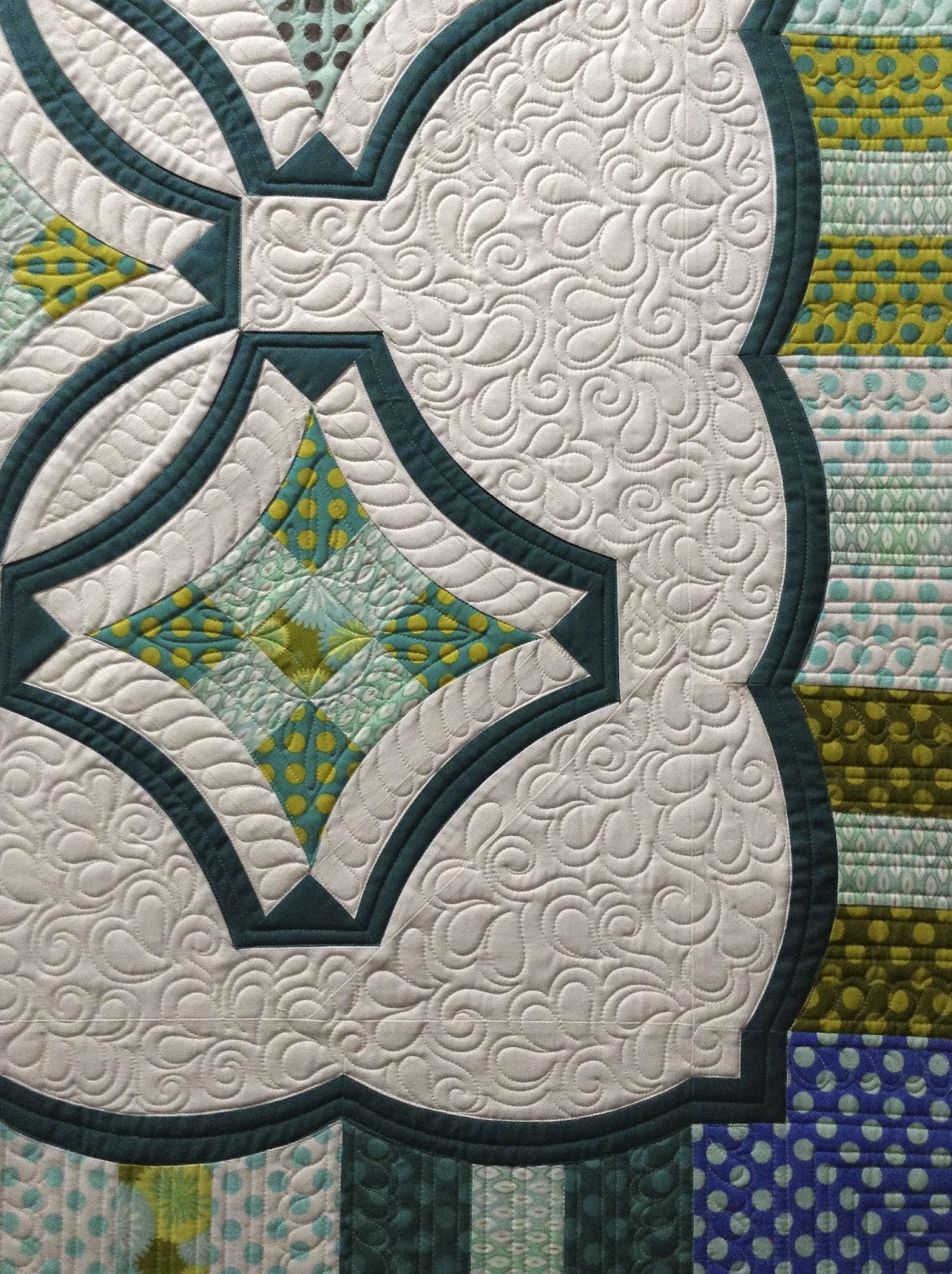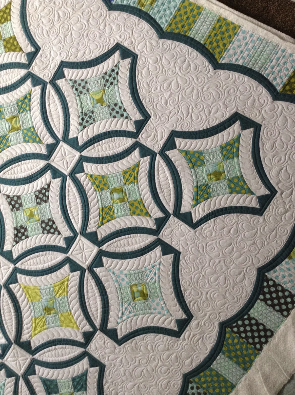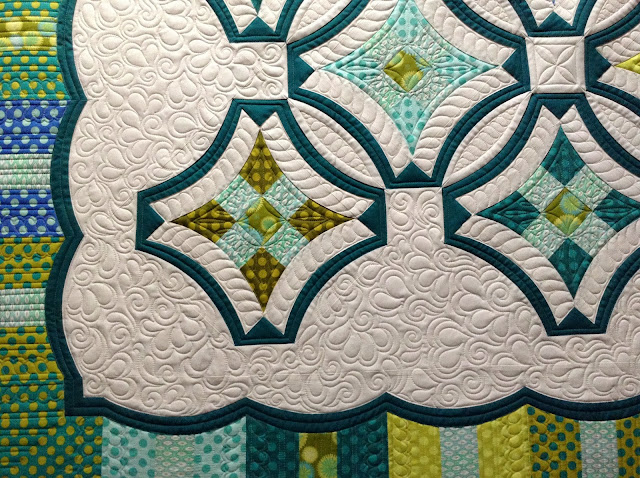 I went back and forth as to what design to do for the open white area in Becky's quilt and after a good night sleep, settled on my feather/swirl all over design. I didn't feel it needed more that that because the scalloped border is fantastic enough!!