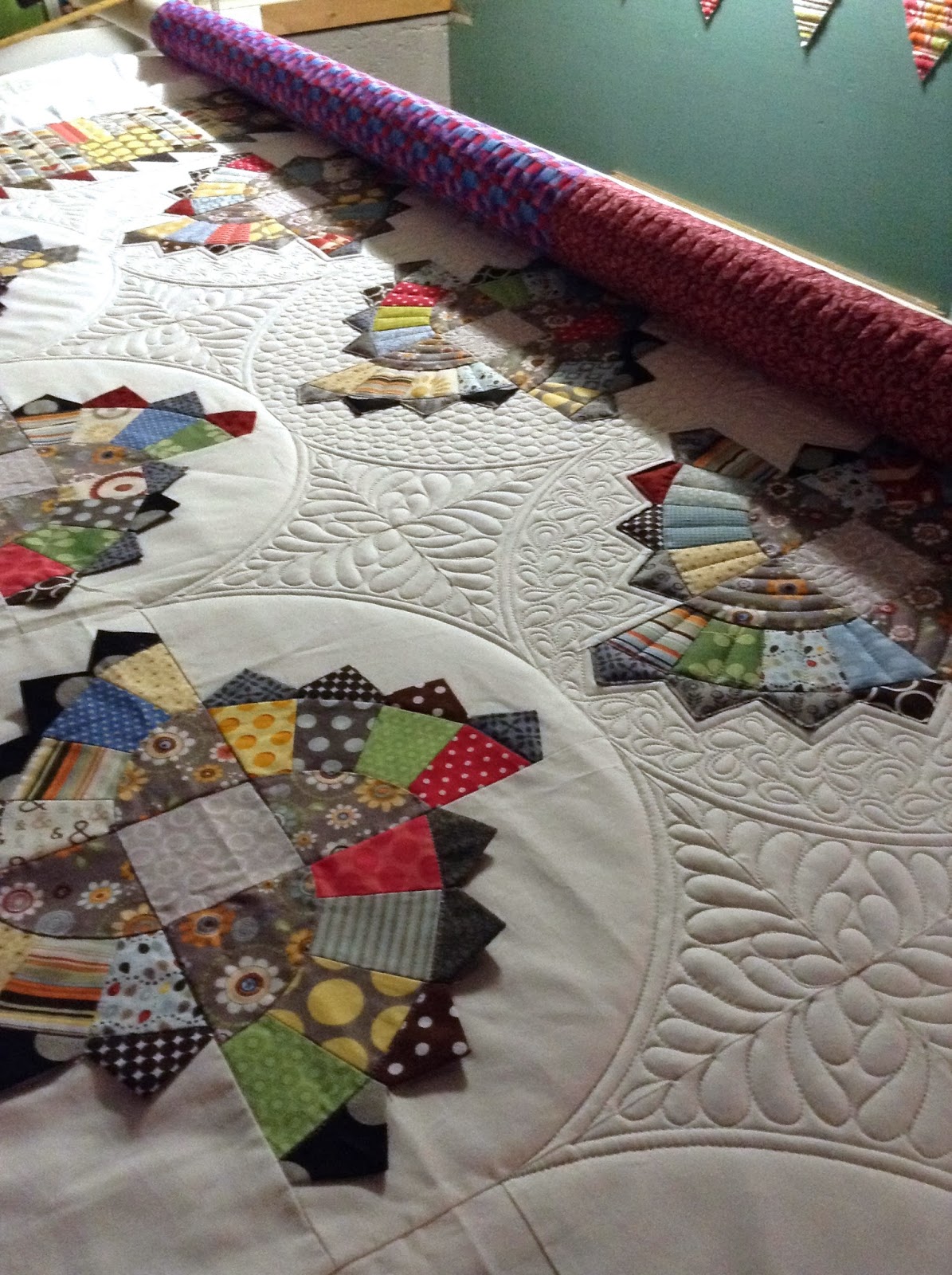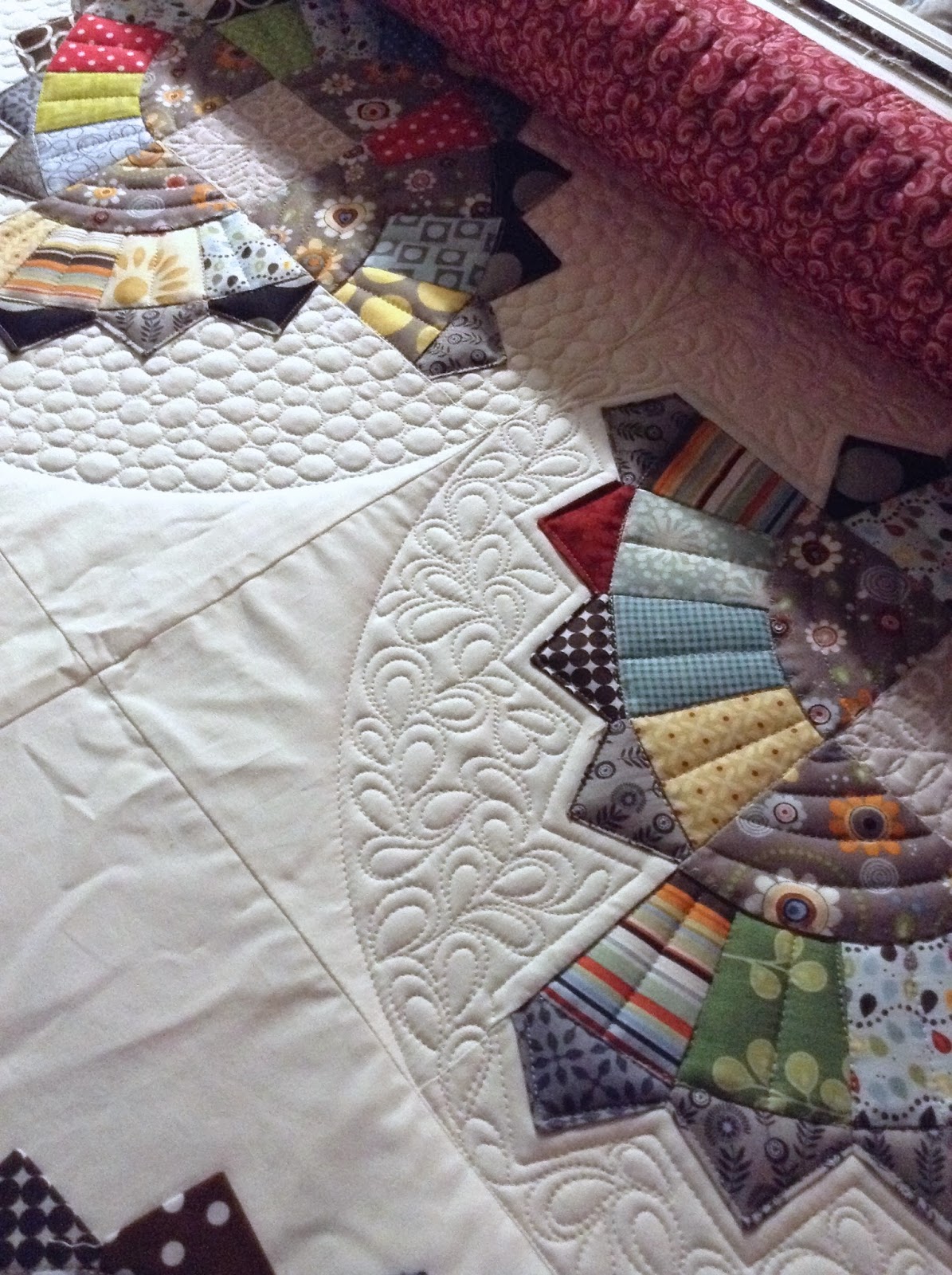 Now about prairie points. Yes, I did stitch the prairie points down. That is what Sharon wanted and frankly I was happy about that! Although they are fantastic and give a great 3 dimensional look to the quilt....they are a bugger to work with, that is if they are left alone and not stitched down. They are beautifully in the way all the time and love to catch the quilting foot as it passes by....and that go's for any sort of 3 dimensional nick nack's that may be on a quilt....buttons, the flappy 1/4" binding, beads...and so on.