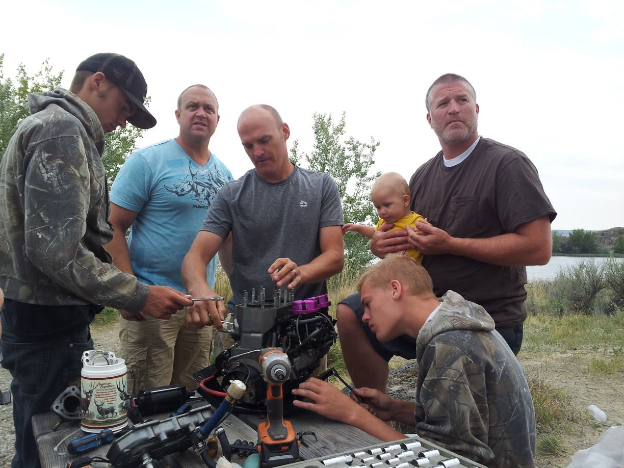 The guys, working on a jet ski motor and having a blast! My husband is in the blue and our friend Darrin is holding baby Ty.