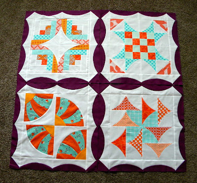 Yesterday, I added the border to this block and loved it right away! I contemplated on what color to use for the border and decided on a plum which looks fantastic with the orange and aqua!