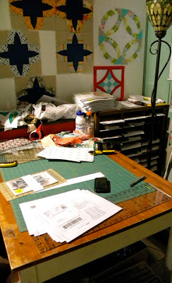 ...currently this is what my work station looks like. This is where I package rulers and do all my cutting. It's also right by the back door, so it's a collect-all area also. Every one's shoes, jackets, backpacks, keys and you name it, gets dropped off here too!! Just a little frustrating, but I've managed to make it work.