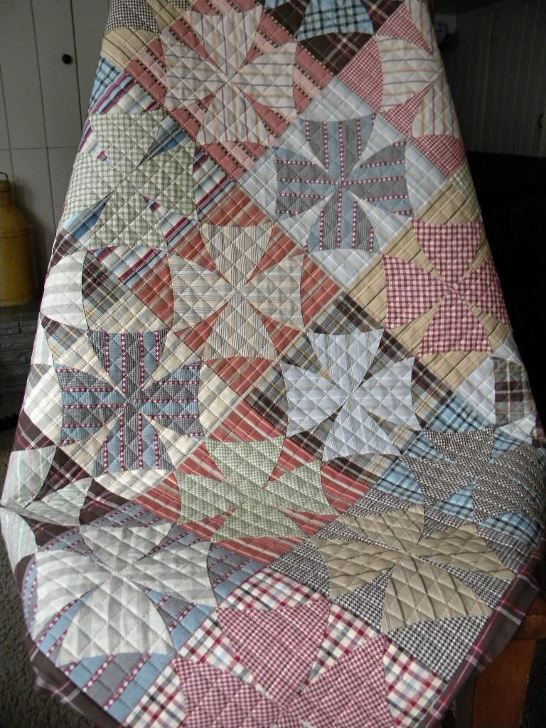 Let's go back a few years. I fell in love with a fat quarter bundle at my local quilt shop, all in plaids and strips. I then came across the perfect pattern for the fabric. The pattern is called Spinning Wheels. The pattern gave you the option to piece your curves or applique them.