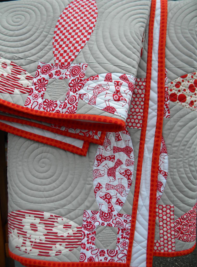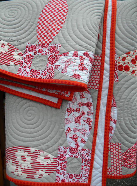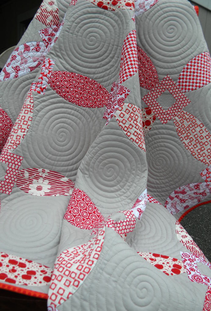 I thought it would be fun to use an orange with red polka dot fabric for the binding. I love the flare it gave this quilt!