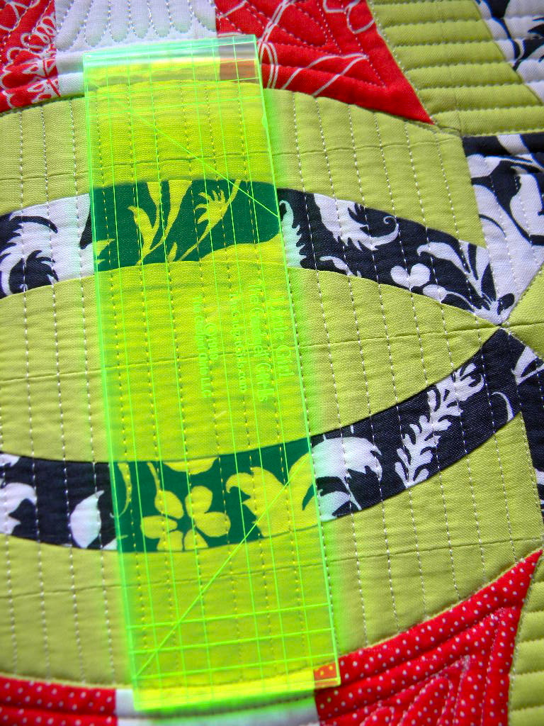 This 7" x 2" ruler by "The Gadget Girls" is my absolute favorite ruler! I use it ALL THE TIME!! It has marking lines so you can use them as a guide when doing parallel straight lines. That's how I did the straight lines for this quilt. I also use this ruler for stitching in the ditch on most all quilts. Another little tip I've found for quilting straight lines is the faster I go, the smoother and easier it is.