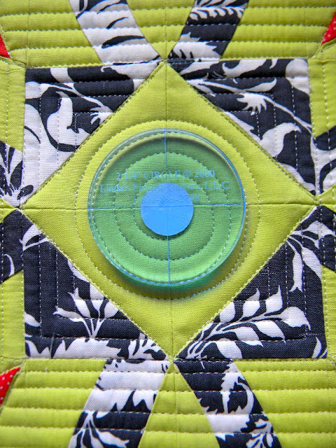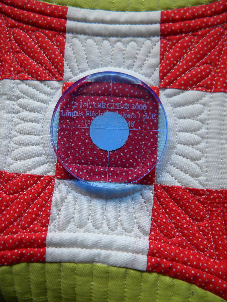 When doing my circle swirl, I first used this 2 1/4" circle to stitch the circle and then I started in the center of the circle and did a freehand swirl out to the stitched circle. I have a set of these blue acrylic circles in different sizes and love them. They have markings so you can center the circle on the fabric, as you can see I've centered the marks on my pieced fabric. I found these at "Linda's Electric Quilters".