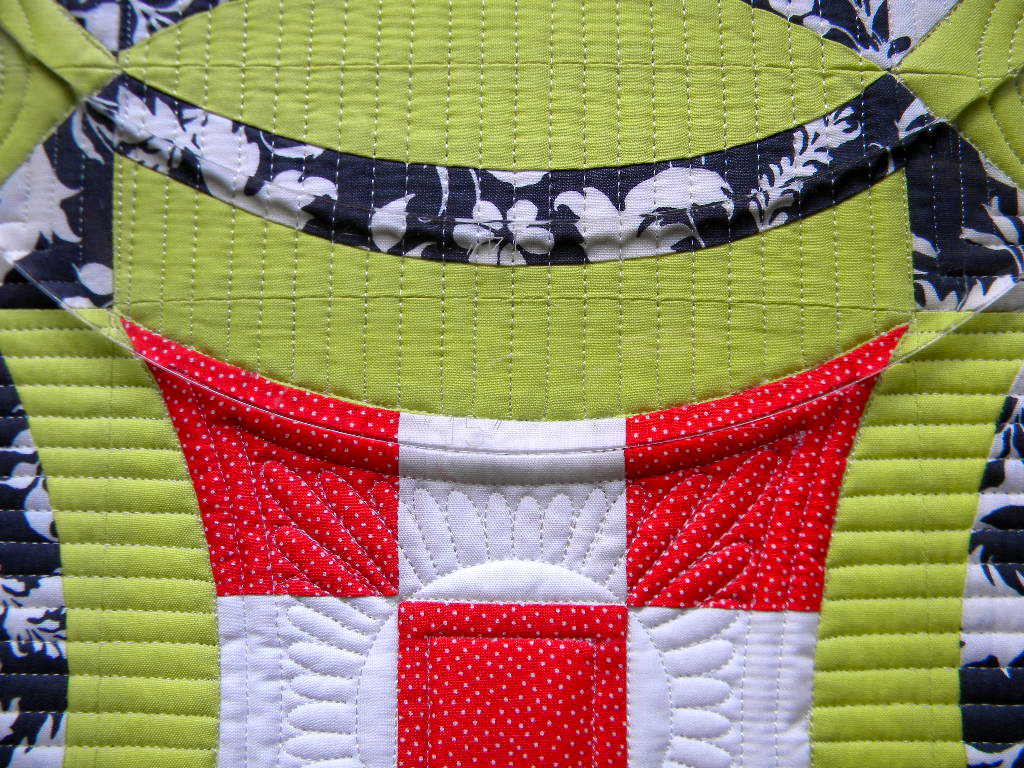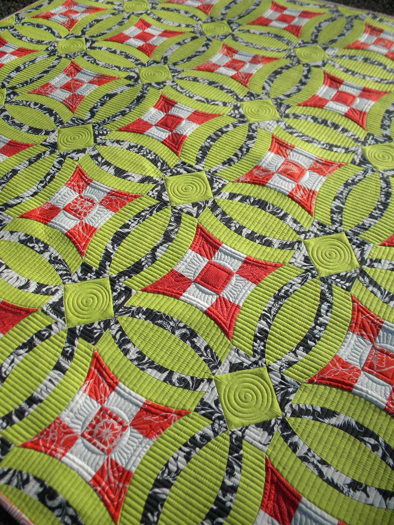 With the straight lines I wanted to showcase the secondary design in this quilt, because of the fabrics and placement of the fabrics I sort of lost that secondary design. I think the straight lines helped showcase it. I love circles, I think you can put a circle on just about any quilt and it gives character and gives your eye something to look at. In this quilt, by putting a circle swirl in the centers helped your eye focus also on that secondary design.