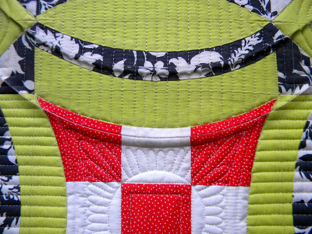 Now for the actual Nine Patch's. I really wanted them to pop, so I accentuated the curve by first stitching in the ditch and then adding two echo curves next to the outside curve 1/4" apart. By doing that it really gave the Nine Patch the "punch" it needed to stand out. Again I added a circle in the center for character and a fun filler for the remaining area's. For the center square....just a stitch in the ditch and one echo to accentuate the square is all it needed.