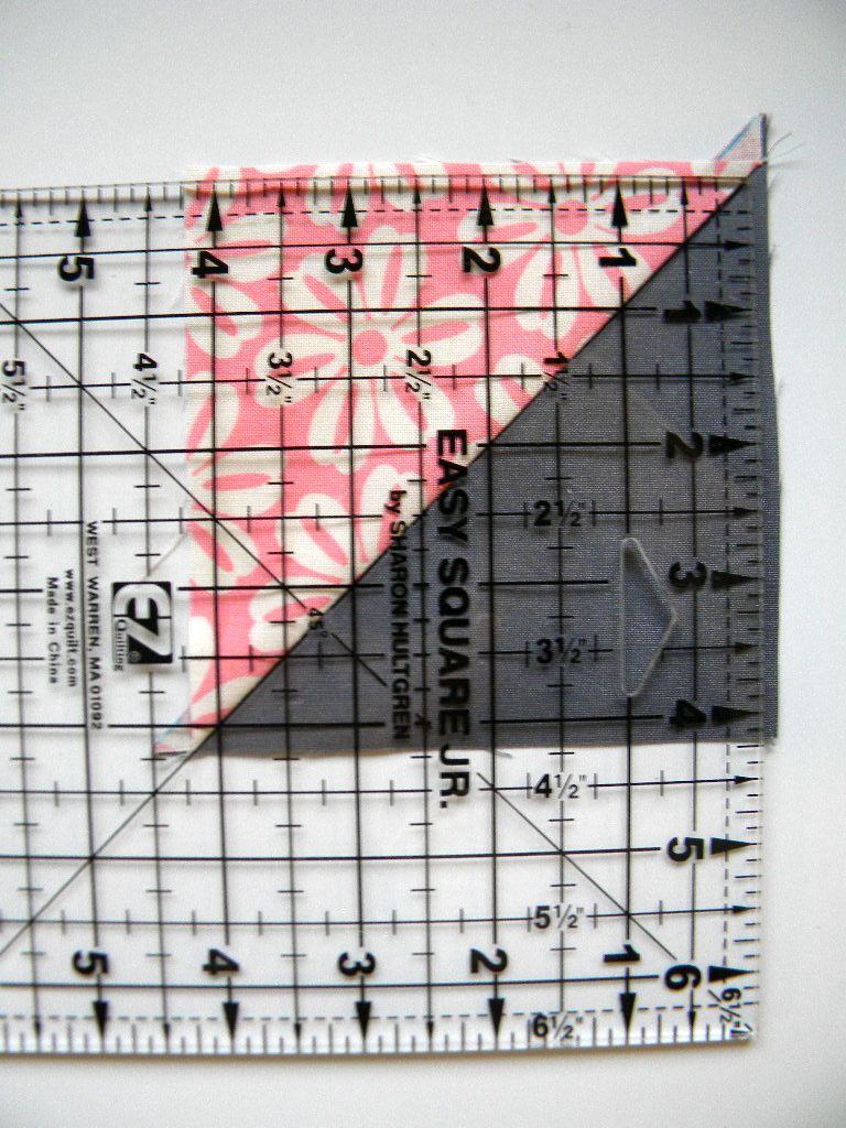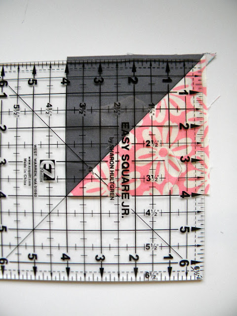 Square up 1/2 square triangles to a 4" square. Line ruler on top, cut right and top side.
