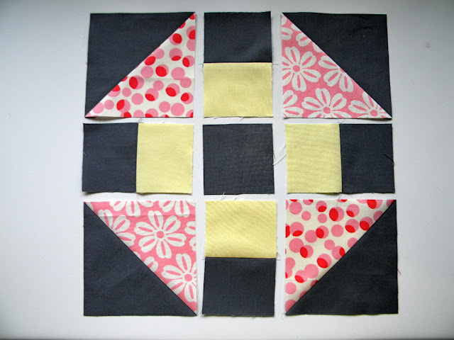 Sew the (4) 2 1/2" x 2 1/4" focus fabric to the (4) 2 1/2" x 2 1/4" background fabric. Make sure to sew on the 2 1/2" sides and press towards the focus fabric. Make (4) sets.
