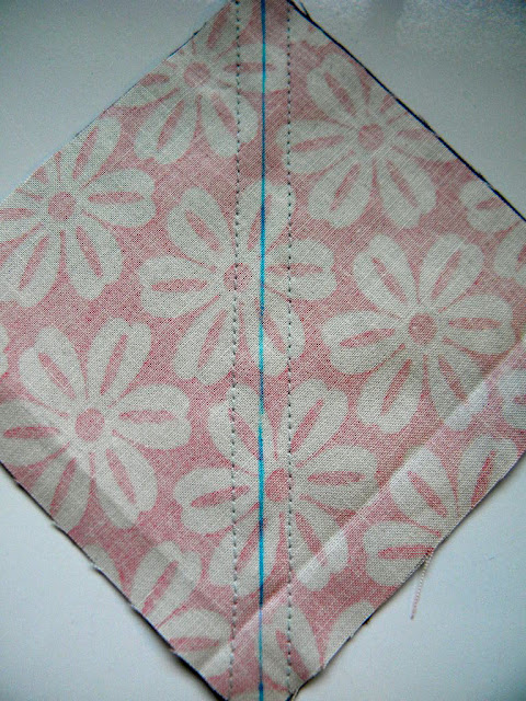 Flip fabric, lining up the two cut edges under the ruler on the 4" marks. Cut other two sides. You will end up with (4) 4", 1/2 square triangles.