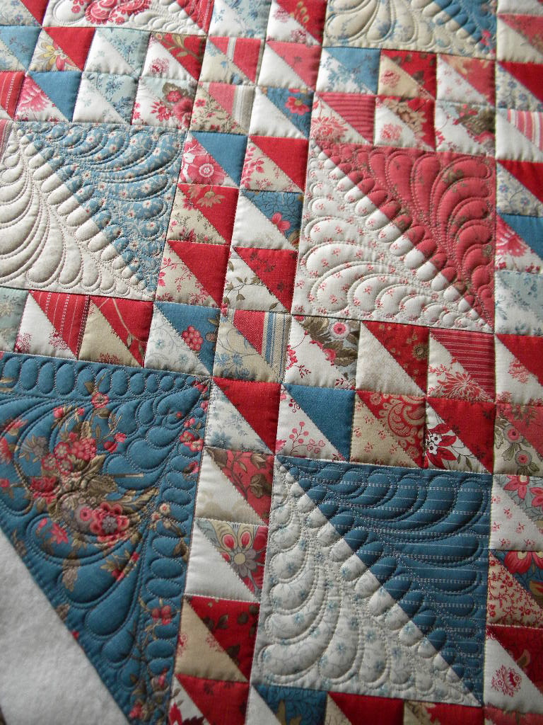 I opted to not do any extra quilting in the 1/2 square triangles because I wanted those to stand out as just being 1/2 square triangles. I stitched in the ditch for them and really like how they stand out as being bold and surround the feather area's like a grid.