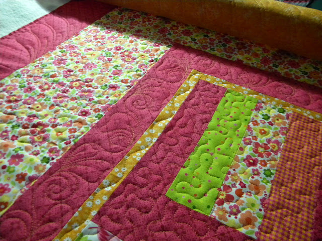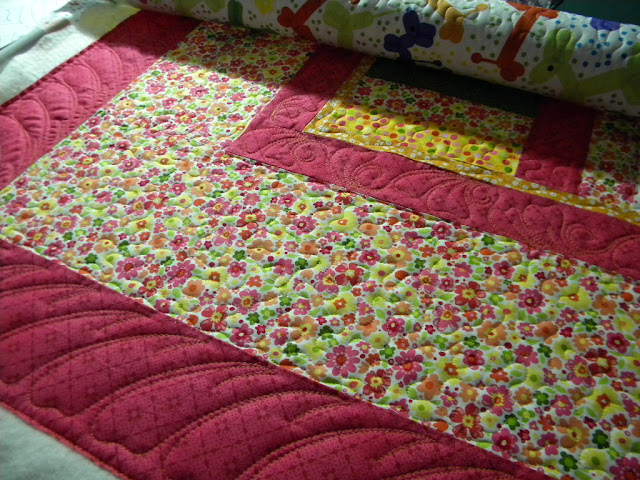 Here is the 2nd quilt I loaded today and I did something fun in the pink borders and a small meander for the rest.