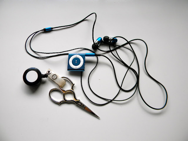 I LOVE these little scissors, they are clipped on to my shirt all day long and I've even been know to where them into the grocery store....and of course a little music helps keep the quilting moving and grooving along.
