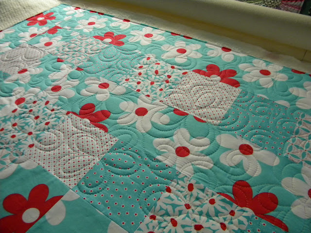 I just adore this fabric and did a freehand daisy~swirl on it. This quilting takes a bit longer than some of the others I've done....but it was so fitting for the quilt. After putting the binding on and trimming it off the machine, I loaded another one: