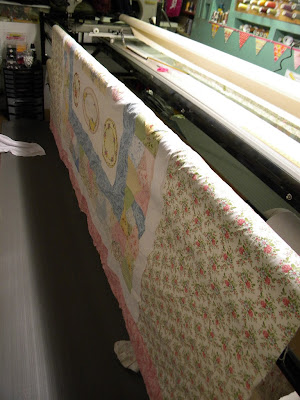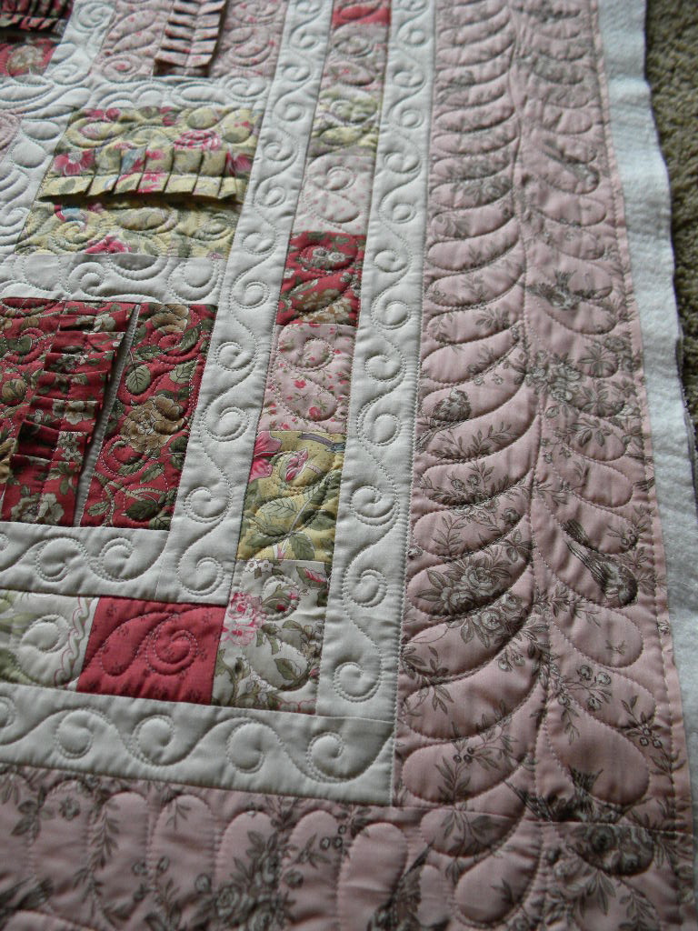 ...here's work in progress. I tried to stay with the theme of the fabric for the quilting. There are those cute little ruffle pleats too, those needed one stitch down the center and on each side.
