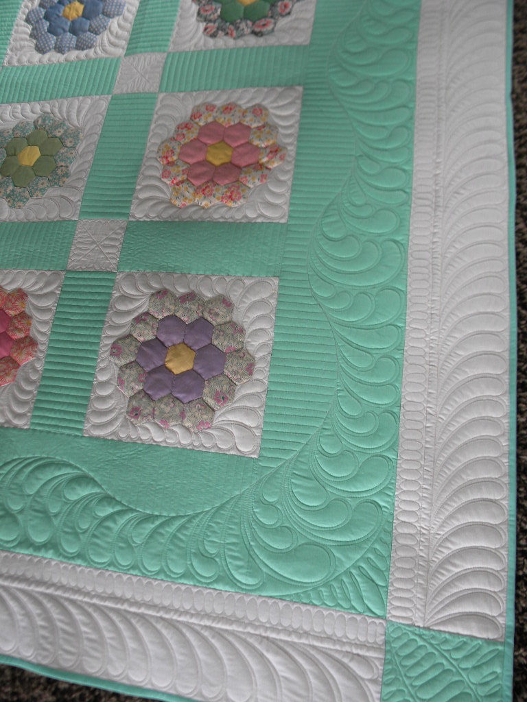 Annette did an amazing job hand piecing the entire quilt. I almost felt a little guilty stitching a million machine stitches into the quilt. Annette had told me that she's hand quilted all of her quilts, but her eye sight would not allow her to anymore and that is why she had me machine quilt it. I'm sure it was hard for her to make that choice, but now it is all finished and will be loved for many years to come!