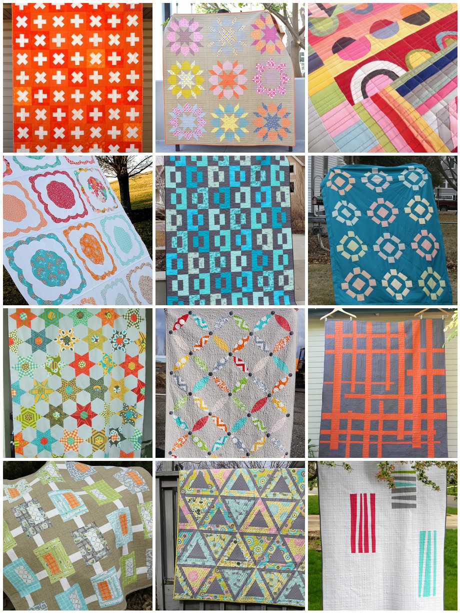 1. math facts quilt, 2. aunt edna swoon quilt front, 3. on the quilting frame, 4. Summerlove quilt, 5. Dual Screen quilt, 6. rolling stone quilt top, 7. all done!, 8. Untitled, 9. Intersections, 10. Finished "Backyard Boy" quilt, pre-wash, 11. Chopsticks quilt, 12. Flashdance