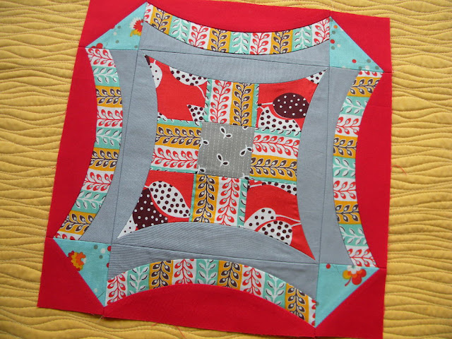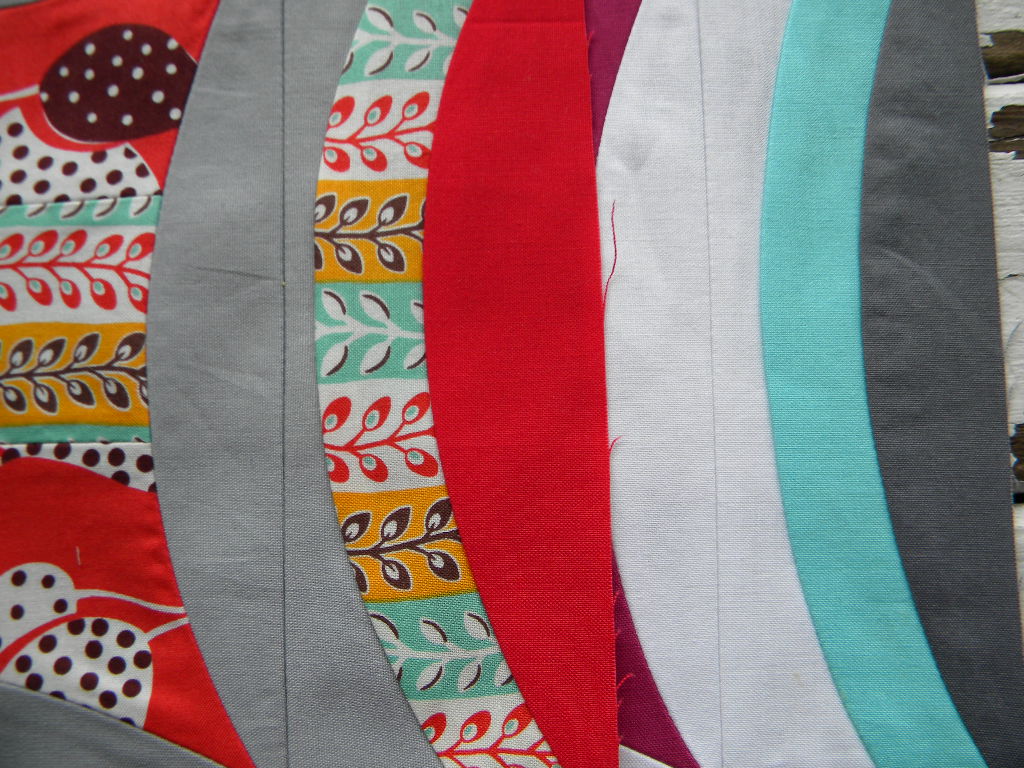 I noticed a difference with the middle curve piece compared to my last solid block (the block I did up for the tutorial). This print fabric is much more flexible. All fabrics when stretched on the bias act differently and this fabric was pretty stretchy.