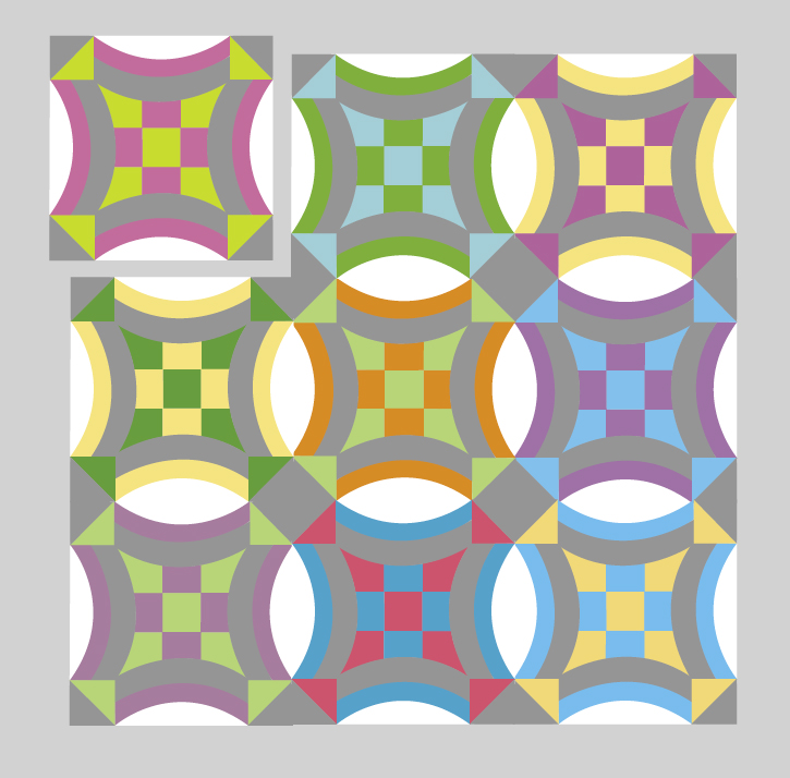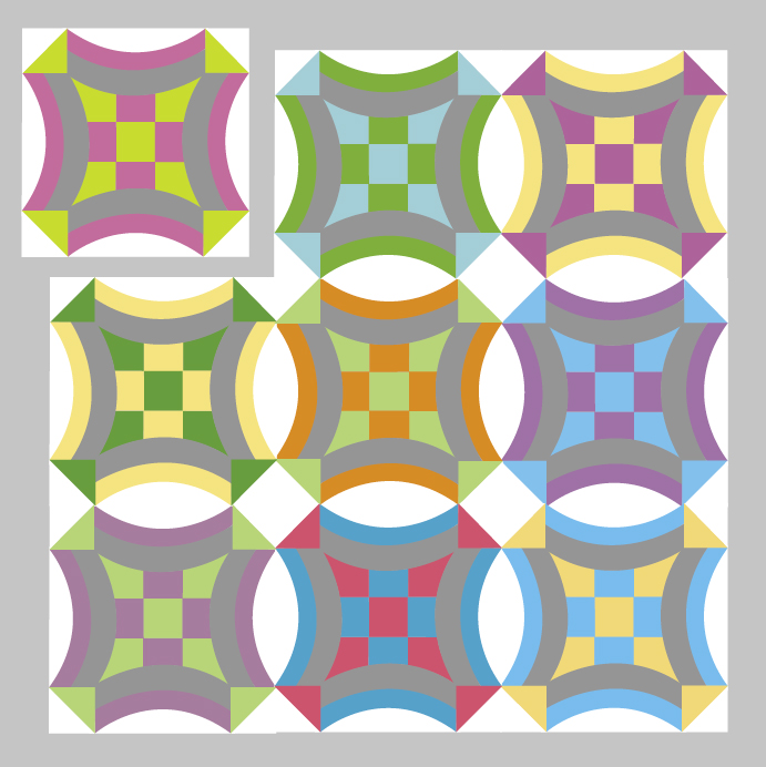 This design uses the gray for the outside nine patch curve and a white for the background. When I look at this design, I don't see the circular design as well, but I see the Urban Nine Patch blocks. And the nine patches don't stand out, like in the design before.