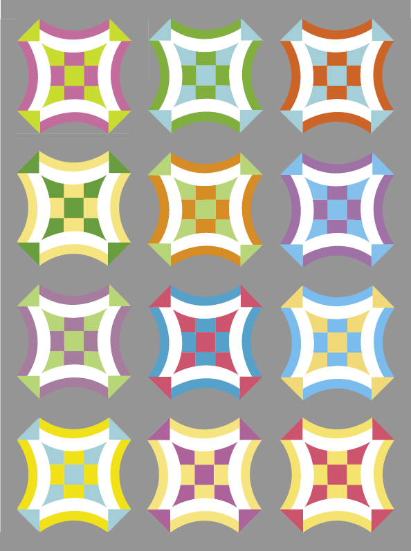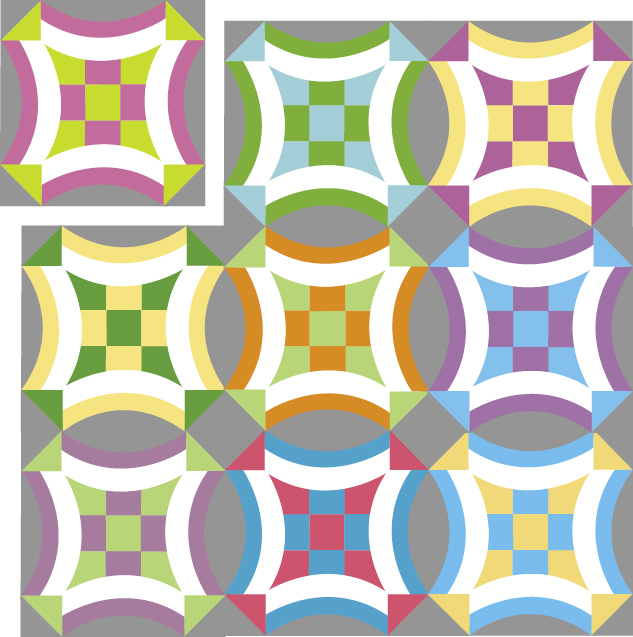 Weather you choose to used solids or prints for your fabric choice, keep in mind to stay consistent with a couple of fabric selections. For instance all of the same small print fabric for your background or for the curve pieces on the outside of your nine patch.