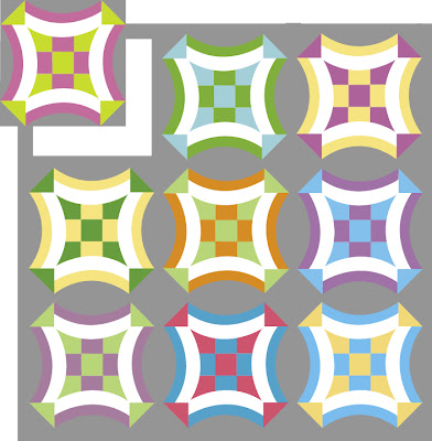 This is one of my favorites! I love the consistency of all the gray curves and the white background. The nine patches, really pop out in the layout too. Again....I used a gray for the 1/2 square triangles instead of the white background. (sample, upper left of design)