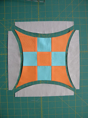 Place the outside curve piece about 1/4 - 1/8 in from corner of nine patch. Sew your curve on, repeat for opposite side of block. Press.