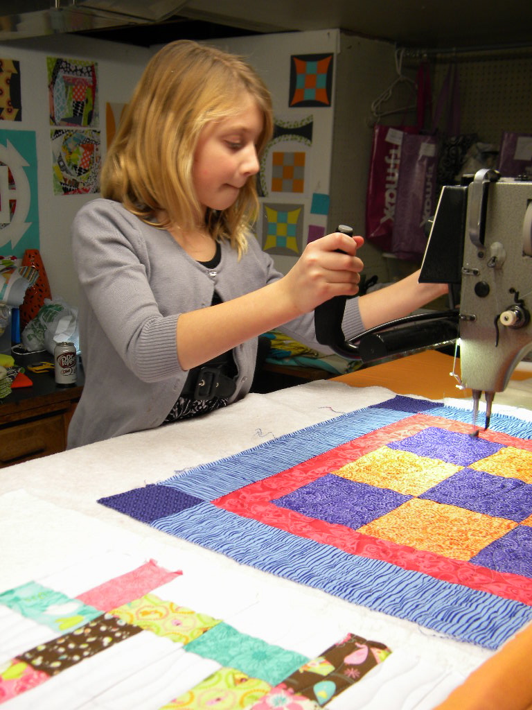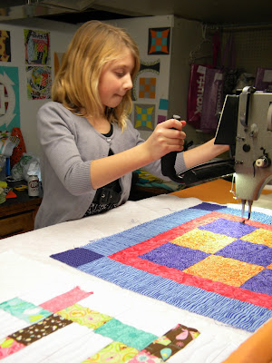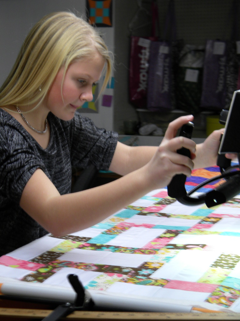 Brooke is quilting a swirly loop....she had to stand on a stool so she could see better and reach the handles better.