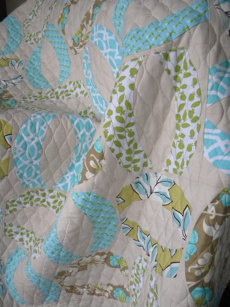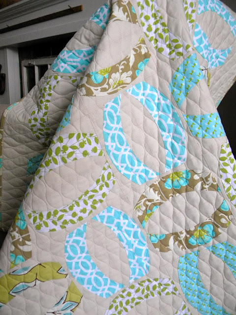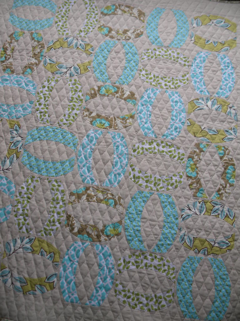 ...so what a great idea for a baby quilt, right? So....if you've bought the Quick Curve Ruler and need an idea for a quilt, all you do is make your basic oval block (directions in the free runner pattern) and then alternate them, add a small binding and you now have an original baby quilt!