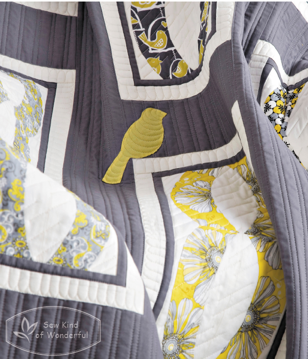 I really liked how this quilt came together. This quilt was the 2nd quilt I did up using my Quick Curve Ruler. When I did this up, I was really inspired by the quilts that had rectangular blocks that just floated on the fabric. And I like the bold contrast in color on this quilt, the charcoal gray with the bright white and yellow.