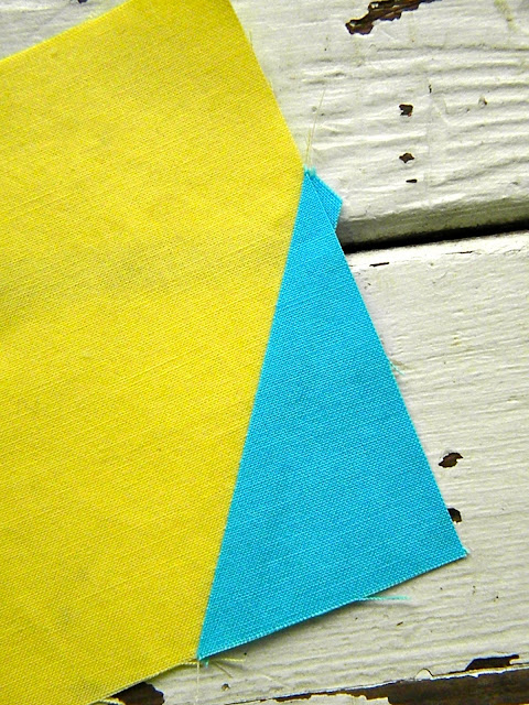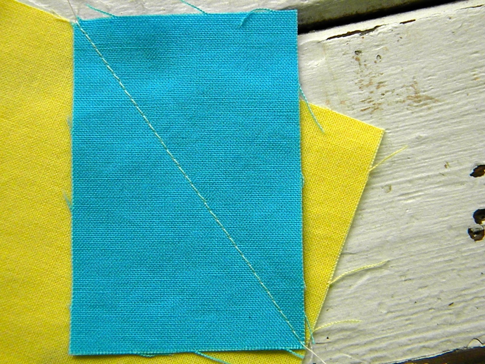 Then you take your rectangle, place opposite corners on each side of the corner block, lining up the drawn line with the side of the rectangle. Sew from one corner to the other.