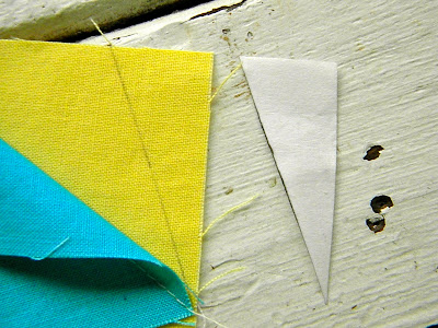 First I made a little freezer paper template, then I taped it to the back of a ruler so the long edge was even with the edge of the ruler.... that way I could use the ruler to draw my lines on the corners of the blocks.