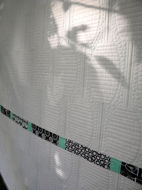 My idea for this quilt was to show case the black and white fabrics. I think sometimes black and white fabric get's lost in so many quilts and you don't get to enjoy the print. I love black and white with aqua blue!