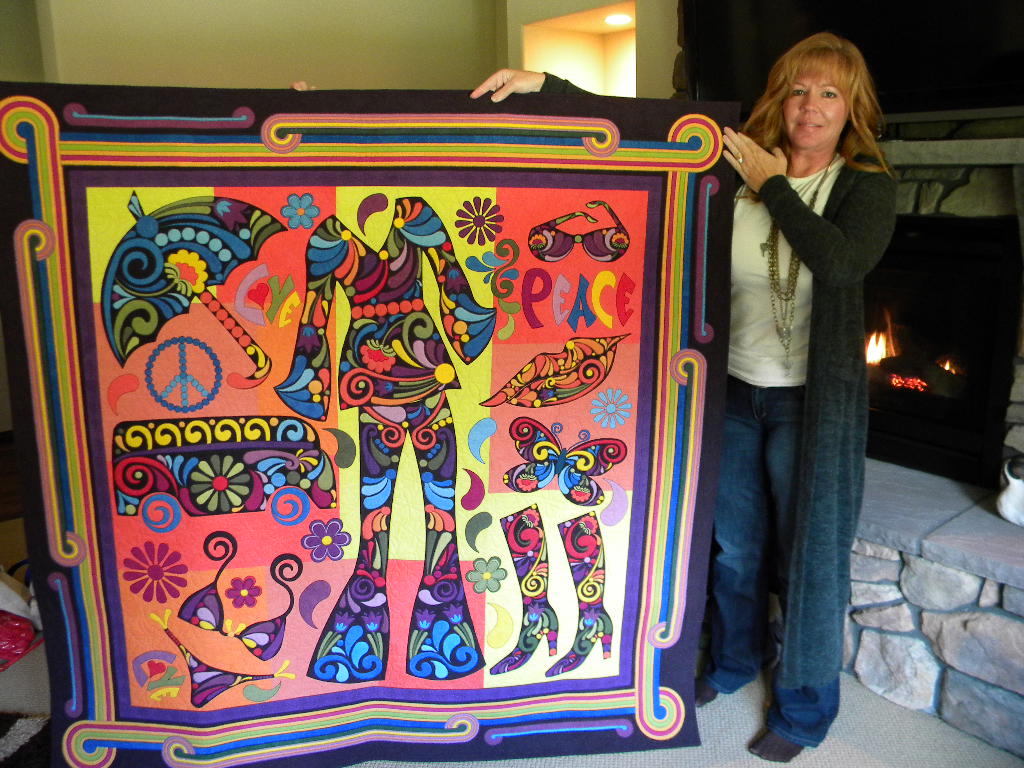 How cool is that quilt! She has a Statler Stitcher and designed this quilt digitally. It's layered applique all done up on her computerized longarm quilt machine. It's really quite amazing close up. I'm still in amazement!! She entered it in the Northwest Expo and won a ribbon for it. I'm thinking were going to see this around much...much...more!