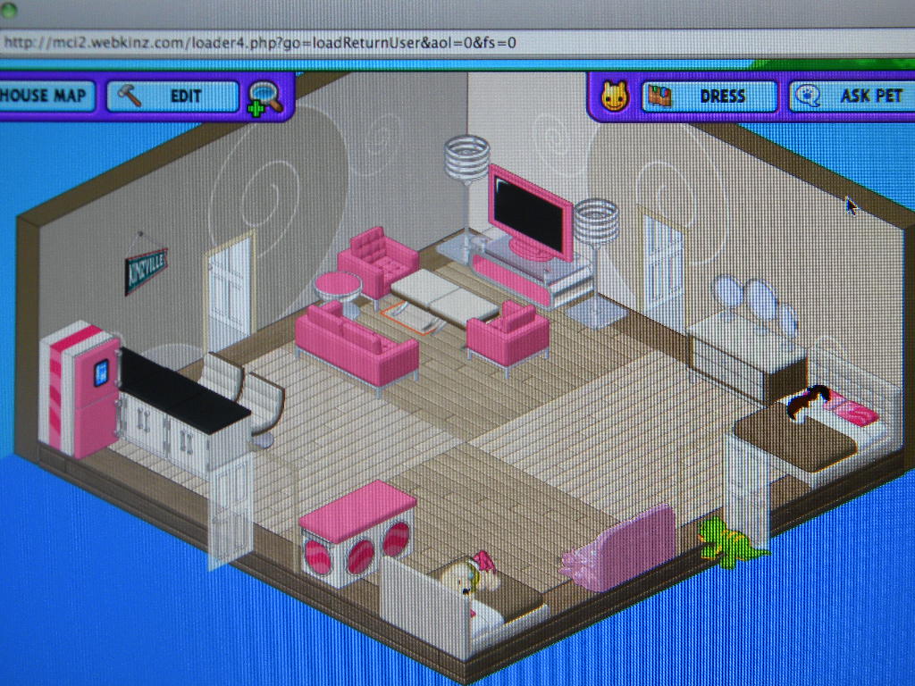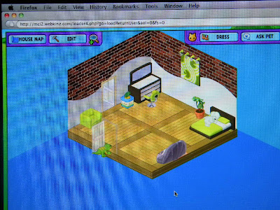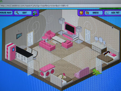 Well I was peeking over my daughter's shoulder...telling her I needed the computer and happen to see these Webkinz rooms. It's an online thingy the kid's like to do and they can create rooms for their pets. I was very proud of her rooms!! Check out the art work in the middle room. I think I'm rubbing off on her? Or maybe she's rubbing off on me!