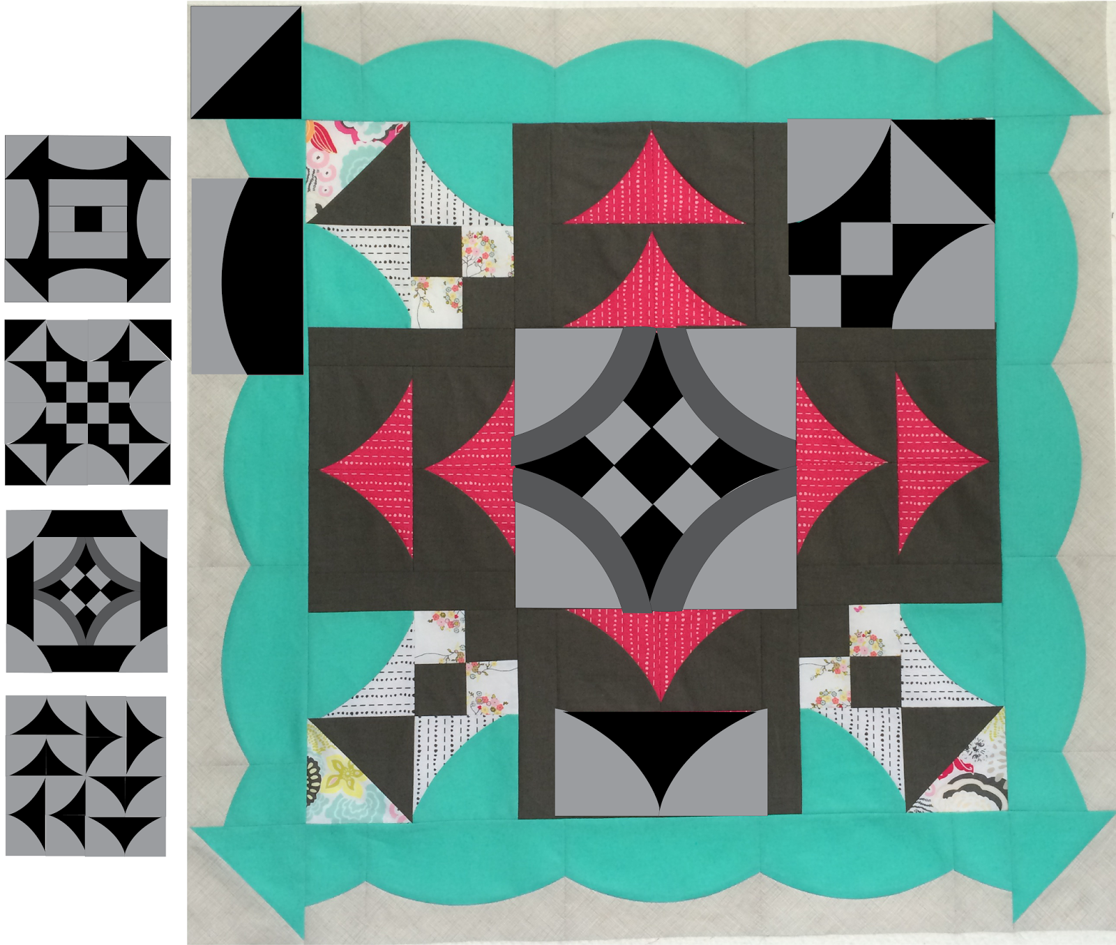 I used the Churndash, Sawtooth, Ninepatch and Curvygeese blocks. You can see above, where they go in my design.