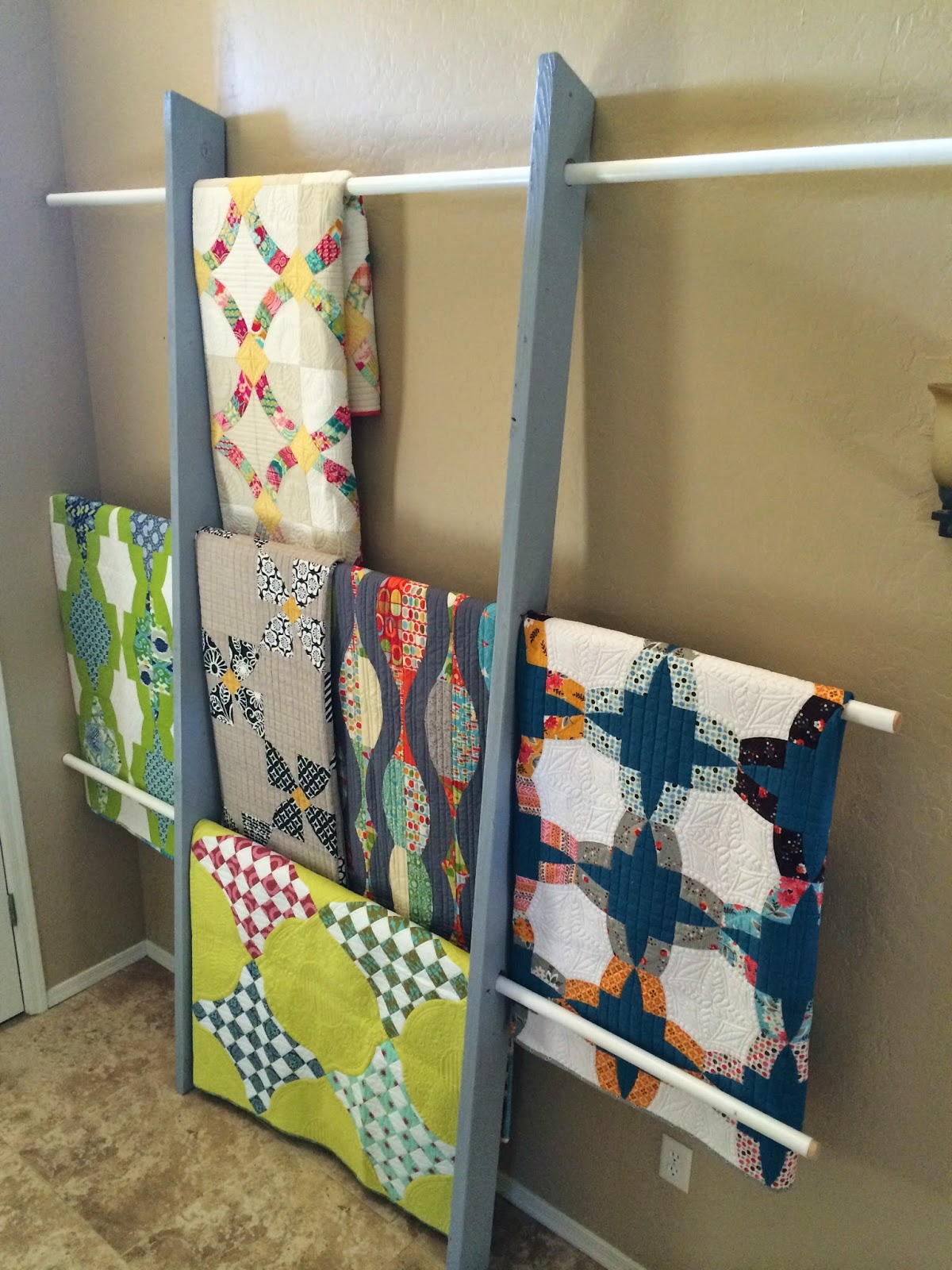 Today we're featuring Helen's "Quilt Built"! So named by her son Seth who helped her build it! :) A fantastic way to show off many beautiful quilts at once. Here are the instructions for those who may be interested in building one yourself. Very simple!