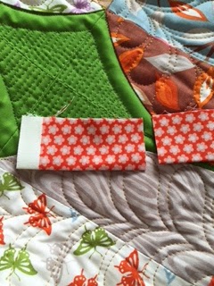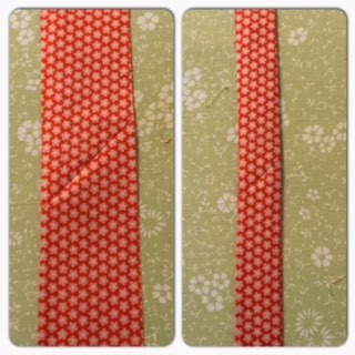 For this quilt I used 2 1/2" binding strips. Make sure prepared binding is at least an extra12-14 inches longer then perimeter of quilt. Begin by placing strips together, as shown, with right sides together.