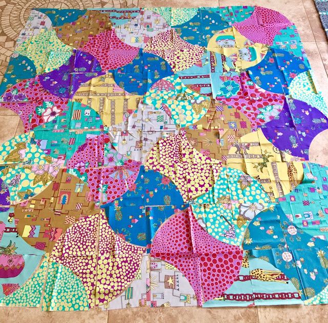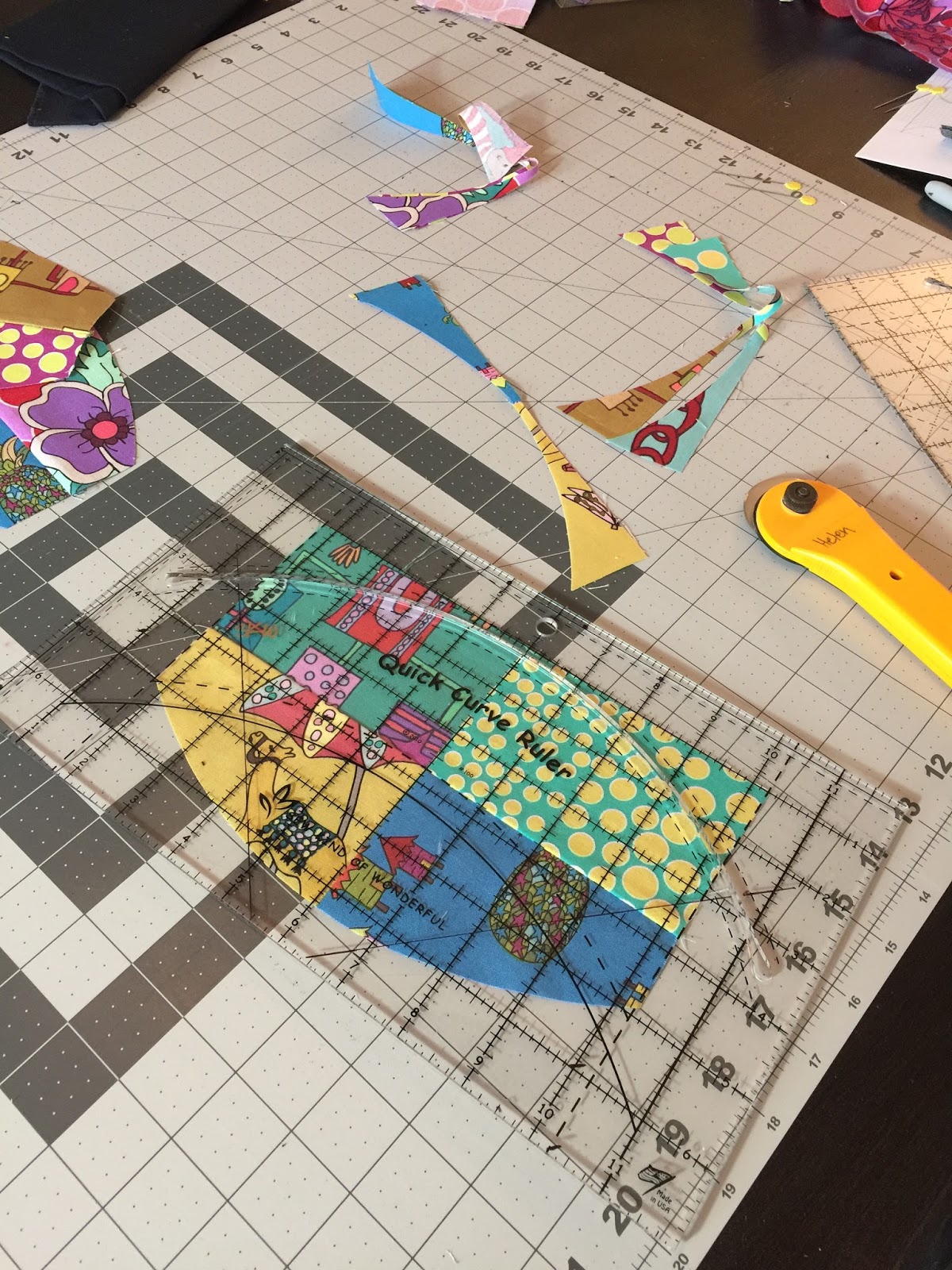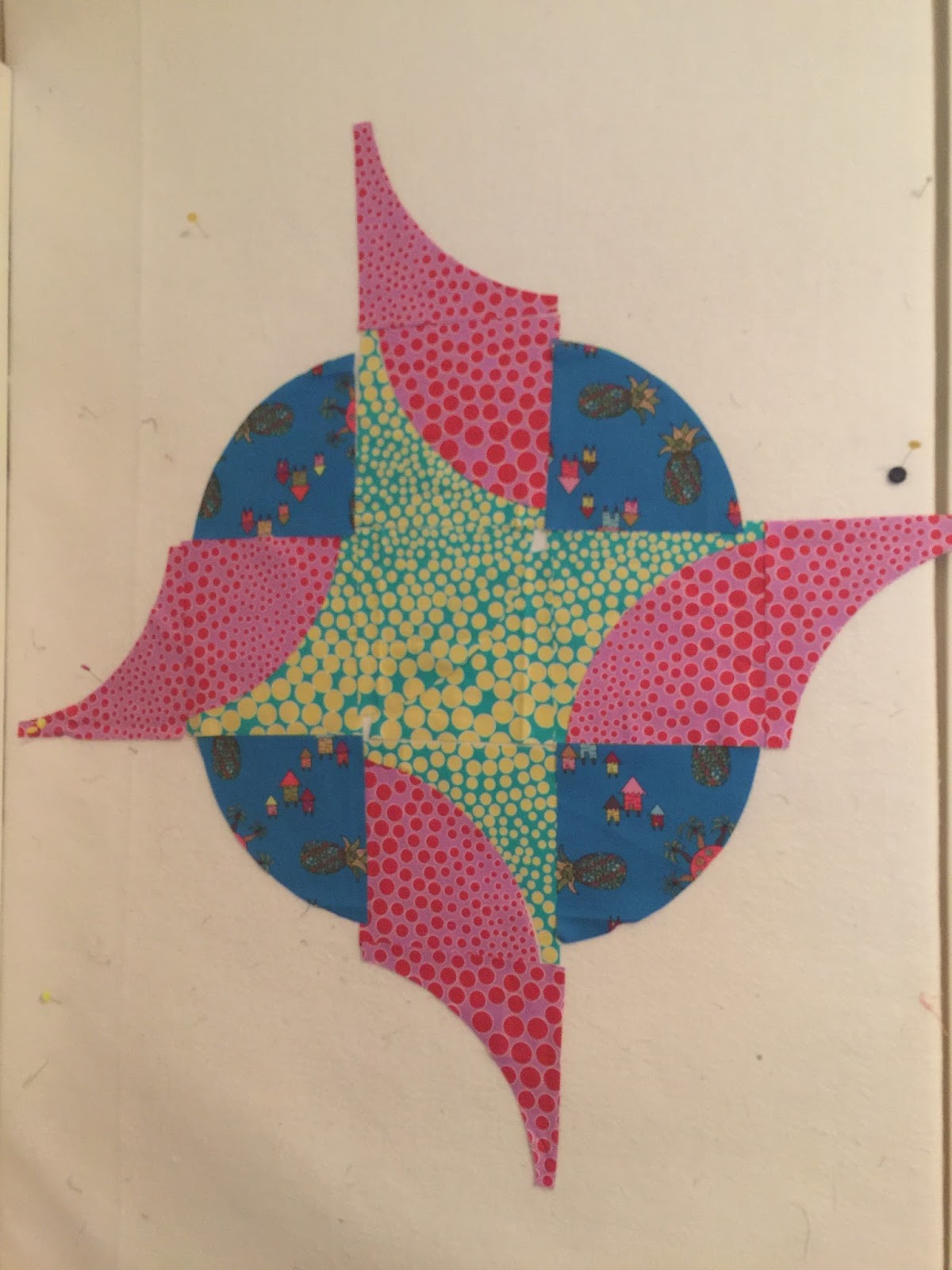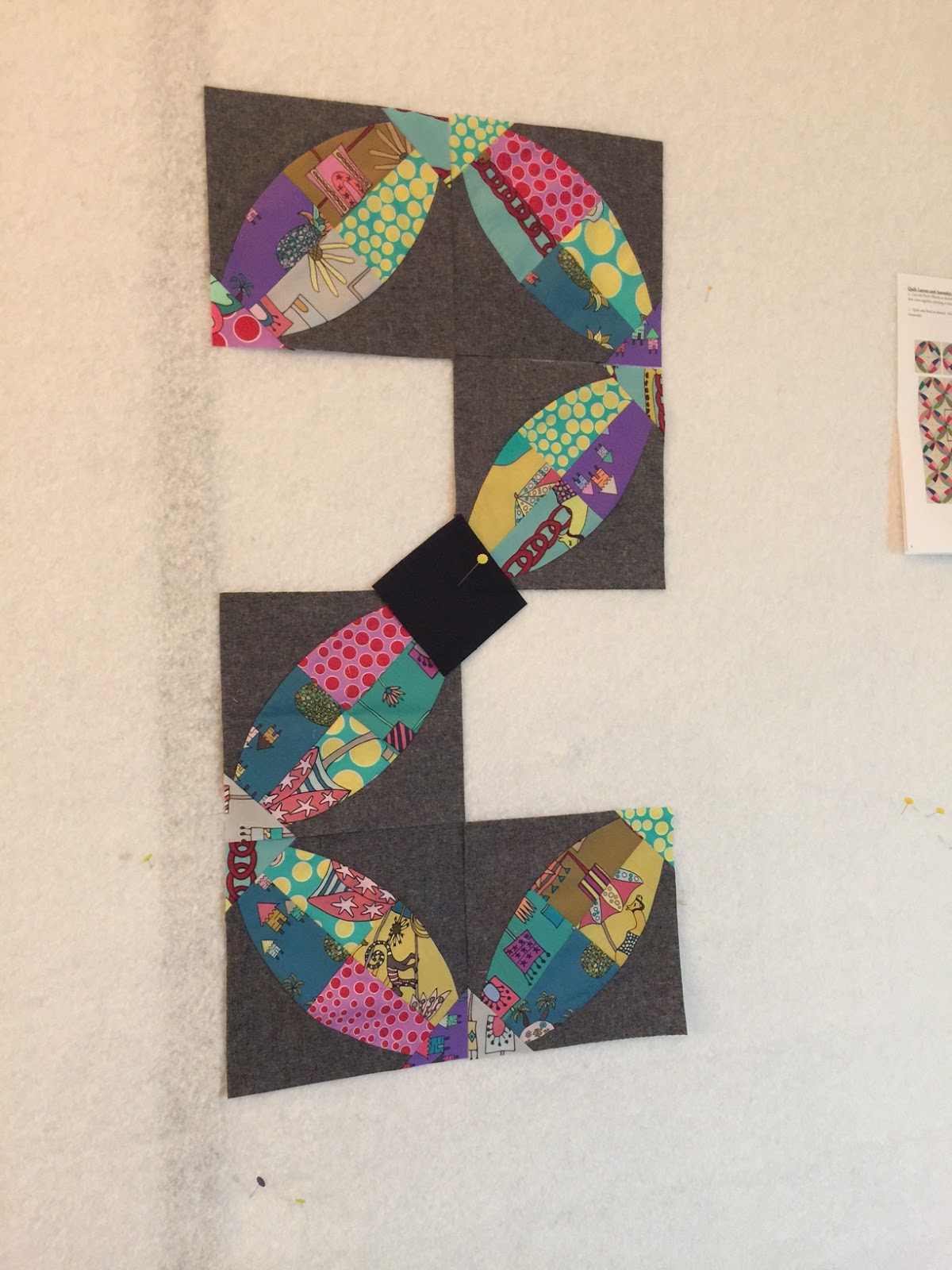 We have been playing with quilt designs that use a curved half square triangle, so I cut a bunch and began laying them out to feel inspired. Here are a couple fun ideas.....